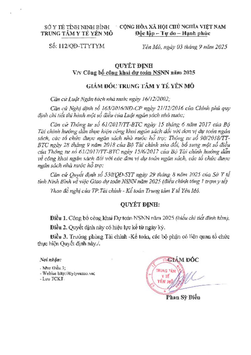 | Số hiệu | 112/QĐ-TTYTYM | Cơ quan ban hành | Trung Tâm Y tế Yên Mô |