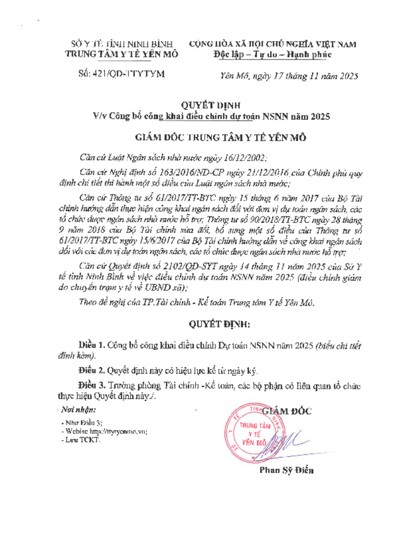 | Số hiệu | 421/QĐ-TTYTYM | Cơ quan ban hành | Trung tâm Y tế huyện Yên Mô |