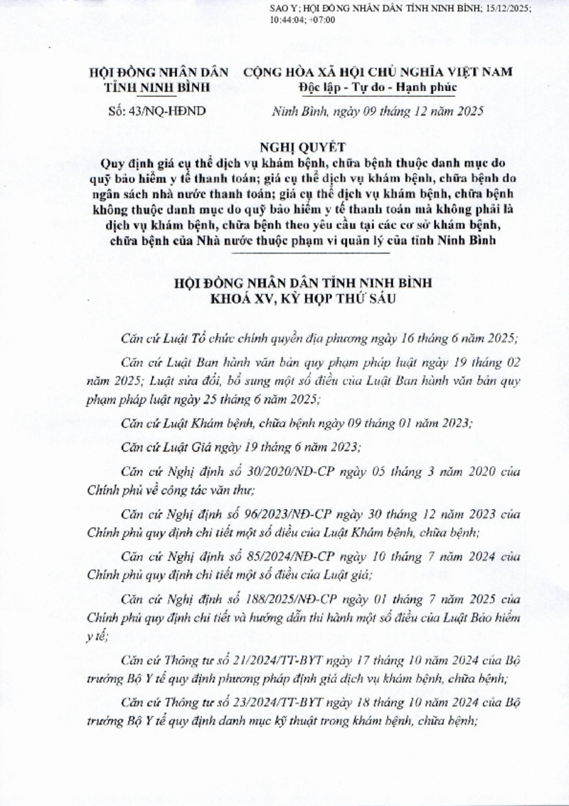 | Mô tả | Quy định giá cụ thể dịch vụ khám bệnh, chữa bệnh thuộc danh mục do quỹ bảo hiểm y tế thanh toán; giá cụ thể dịch vụ khám bệnh, chữa bệnh do ngân sách nhà nước thanh toán; giá cụ thể dịch vụ khám bệnh, chữa bệnh không thuộc danh mục do quỹ bảo hiểm y tế thanh toán mà không phải là dịch vụ khám bệnh, chữa bệnh theo yêu cầu tại các cơ sở khám bệnh,chữa bệnh của Nhà nước thuộc phạm vi quản lý của tỉnh Ninh Bình |
